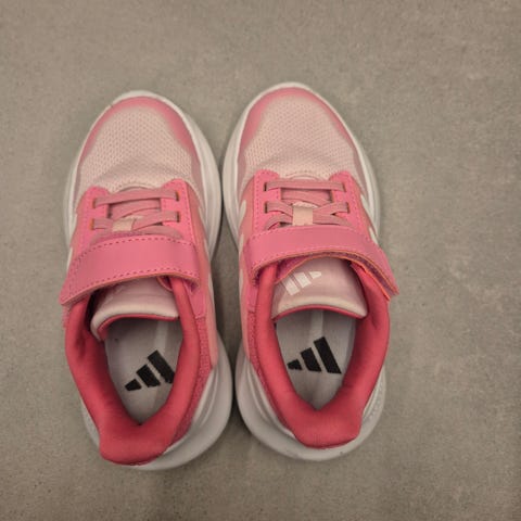 Adidas joggesko i størrelse 34. Skoene har overdel i tekstil og syntetisk materiale med kombinasjon av rosa og lyse detaljer. Lukkes med lborrelås over vristen for justerbar passform.