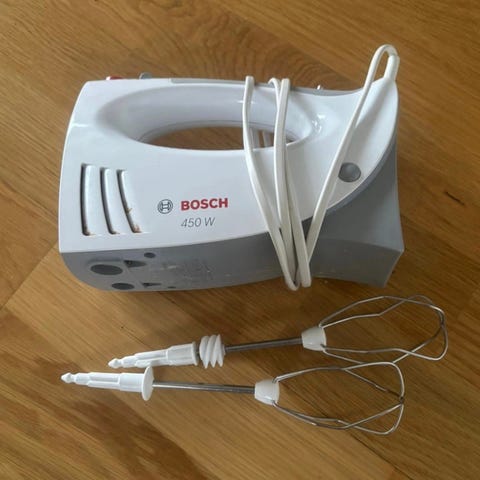 Bosch CleverMixx håndmikser på 350 W i hvit utførelse. Håndmikseren har ergonomisk håndtak og leveres med to visper og to eltekroker som kan tas av og på via festehull på undersiden. Egnet til pisking av krem og egg, samt elting av ulike typer deig. Strømkabel medfølger, og apparatet brukes til vanlig stikkontakt (230 V).