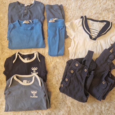 2 body, en selebukse, strømpebukse med antiskli på fot og knær, og et sett med seleshort og t skjorte, sett fra dukje stt 74/80.