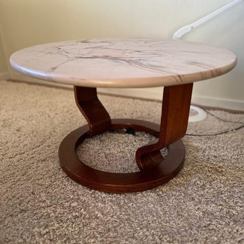Rundt bord i brunt treverk. Må hentes.