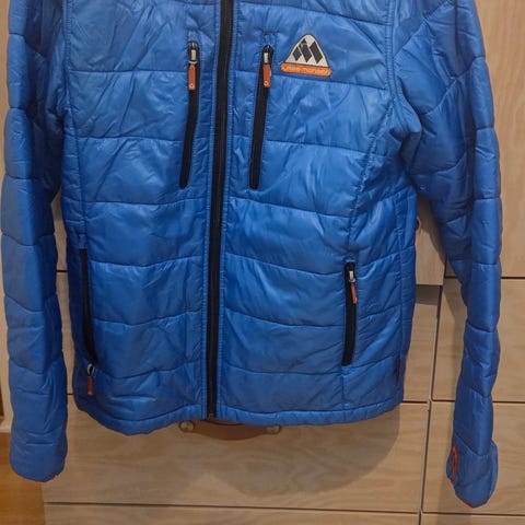 Blå herrejakke i størrelse S laget av nylon. Jakken har vattert mønster, hette og glidelåslukking foran. Innsiden er rødfarget og jakken har glidelåslommer i sidene. Egner seg som ytterjakke til hverdagsbruk og lettere utendørsaktiviteter.