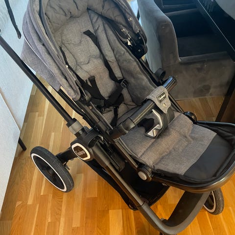Emmaljunga barnevogn i grå tekstil med sort understell. Vognen har fire hjul med hvite felger, justerbart håndtak og varekurv under setet. Seteenheten kan vendes begge veier, og det følger med liggedel og sittedel som vist på bildene. Kalesjen kan trekkes godt over barnet for skjerming. Passer til bruk fra nyfødt med liggedel og videre som sportsvogn med sittedel.