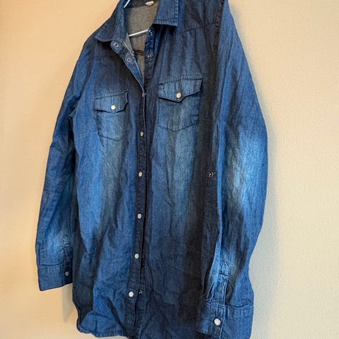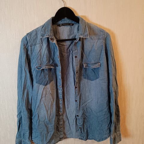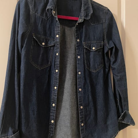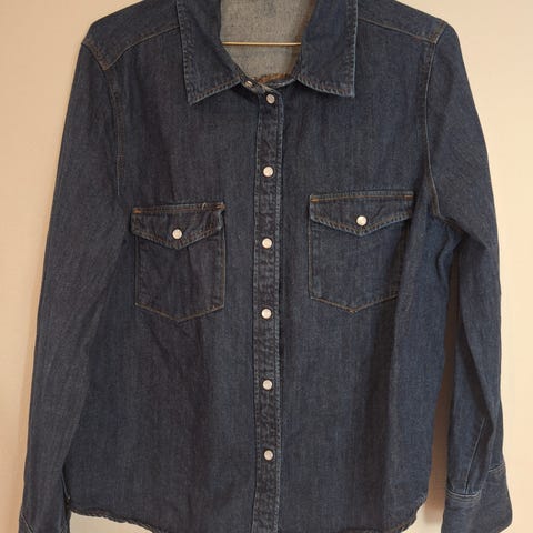 H&M denimskjorte for dame i størrelse 42. Skjorten er i blå denim med lange ermer og klassisk krage. Den har knappelukking foran og brystlommer med klaff og knapp. Materialet er denim (bomull), som gir et robust og strukturert uttrykk.