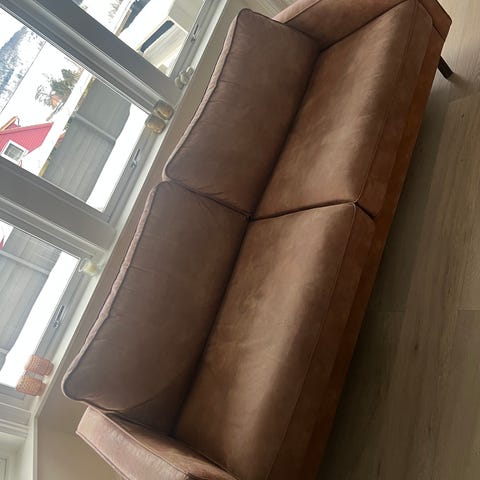 Den er godt brukt og har synlig slitasje i stoffet (se bilder), men er fortsatt stødig og fullt brukbar. Perfekt til hybel, studentbolig, kjellerstue eller som en rimelig ekstrasofa.