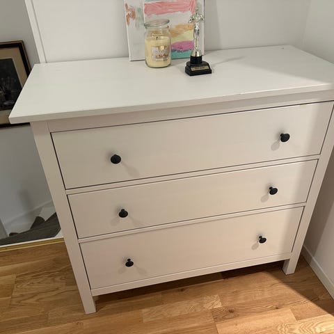 Denne hvite Hemnes-kommoden selges rimelig grunnet bruksmerker og en skuff som har blitt limt på, grunnet den ikke satt godt nok på. Ville anbefalt å fjerne lim, og sette fronten ordentlig på. Mistenker at datter hatt for mye i den, og at det er derfor den var slik.