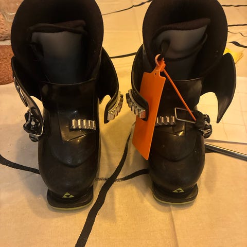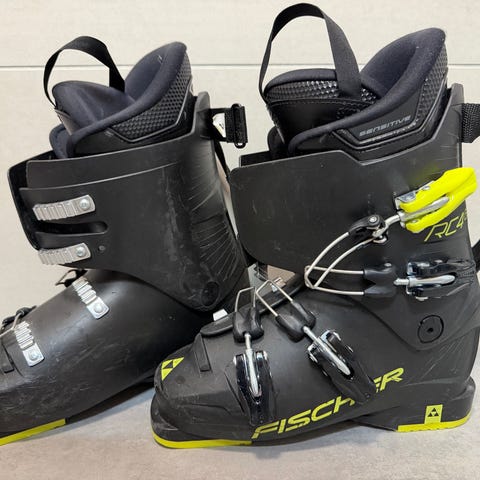 Fischer alpinstøvler for barn i størrelse 235. Støvlene er i svart med gule detaljer og har fire justerbare spenner for god tilpasning rundt fot og legg. Passer til vanlig alpinbruk i skianlegg. Sålelengde er merket under støvlene til 273 mm.