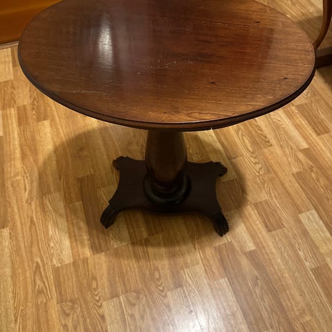 Sidebord i mørkt tre med rektangulær bordplate og opphøyd kant. Bordet står på en dreid søylefot med tre ben. Under bordplaten er det to små skuffer med knotter i metall. Egner seg som lite avlastningsbord, nattbord eller lampebord i stue, gang eller soverom.