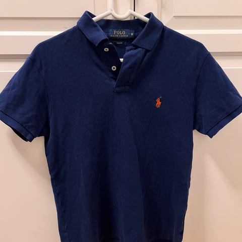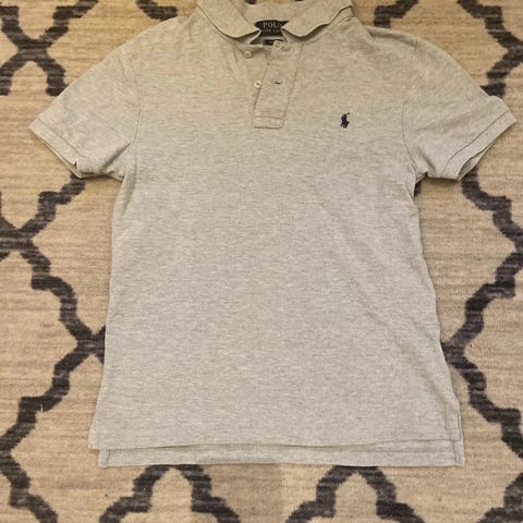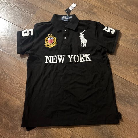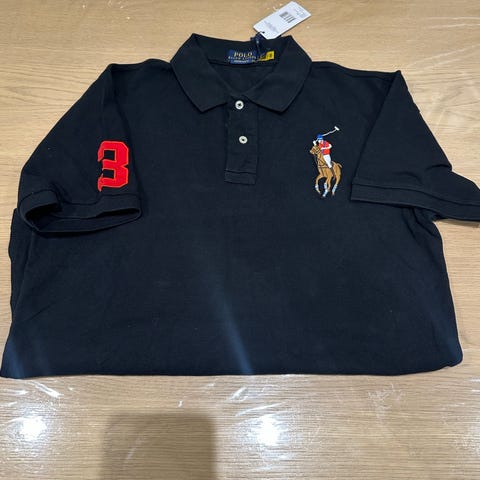 Ralph Lauren Polo pique for herre i størrelse S. Piquen er flerfarget med mørk hovedfarge og kontrastfargede gule ermer og detaljer. Materiale i bomull. Klassisk poloskjorte med krage, knepping i halsen og trykte broderte detaljer foran og tall på ermene og ryggen. Passer som hverdagsplagg eller til fritidsbruk.