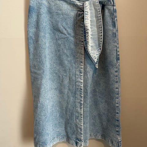 Lindex olaskjørt i denim for dame i størrelse 42. Skjørtet er i blå denim med klassisk femlommers jeansdesign, beltehemper og gylf med knapp og glidelås. Modellen har splitt foran som gir bedre bevegelsesfrihet. Materialet er denim, som gir et robust og slitesterkt plagg egnet til hverdagsbruk.