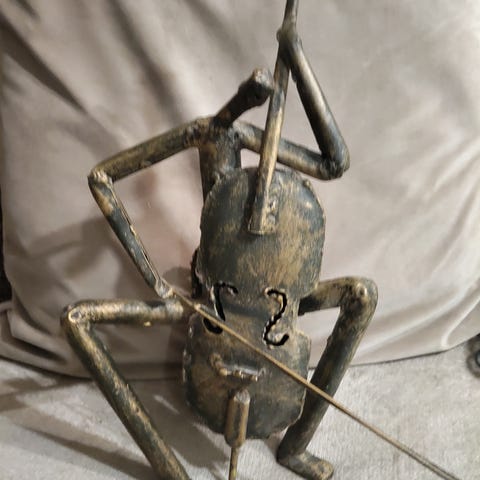 Brutalistisk Metallskulptur utformet som en stilisert menneskefigur i sveist metall. Figuren står på en rektangulær metallfot og har en enkel, geometrisk form med lange ben og markerte armer. Overflaten har et røft, industrielt preg med synlige sveisespor og en mørk metallfarge med lysere partier. Egnet som dekorativ gjenstand i for eksempel stue, kontor eller gang.