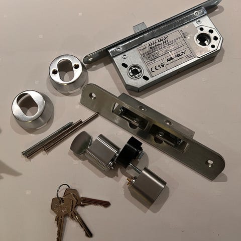 På bildene vises også skruer og festemateriell til montering. Nøkkelen er merket Assa og er tilpasset låskassen i settet.