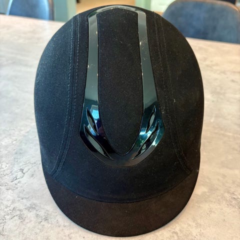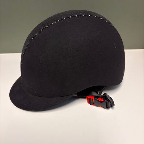 CRW ridehjelm i svart med glitterdetaljer og dekor langs midtpartiet. Hjelmen har justerbar hakereim med klips og innvendig mesh-fôr for ventilasjon og komfort. Ridehjelm til hestesport og ridning. Pent brukt i 6 mnd. ikke fall.