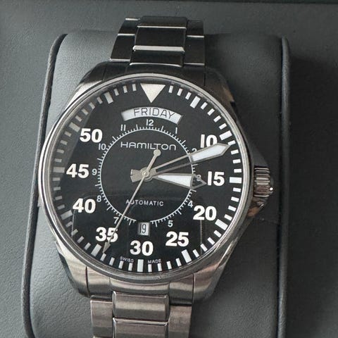 Purposefully muted and simple design with a matt black dial (very slight sunray under certain light), no date. H-10 automatic movement with a long, 80-hour power reserve.