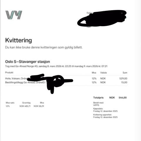 Go-Ahead togbillett for strekningen Lysaker / Oslo–Stavanger med sovekupé. Søndag 1 mars 22:36