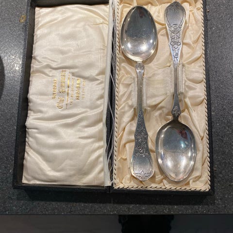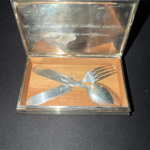 Tinn-Per bestikksett med to skjeer i tinn. Skjeene har dekorgravert skaft med mønster i nordisk stil. Leveres i original eske med innvendig tekst om produktet. Egnet som serveringsskjeer eller til bruk ved borddekking der man ønsker bestikk i tinn.