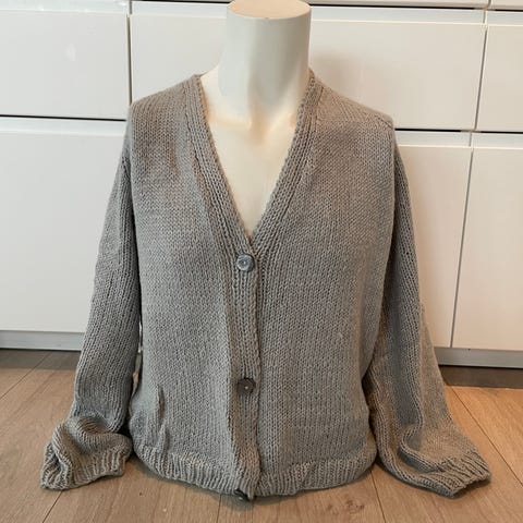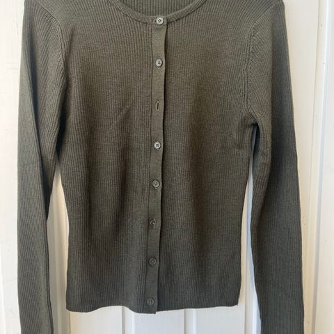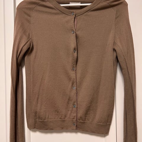 Cubus cardigan for dame i størrelse S. Cardiganen er beige og laget av ull. Den har V-hals, lange ermer og knepping med knapper foran.