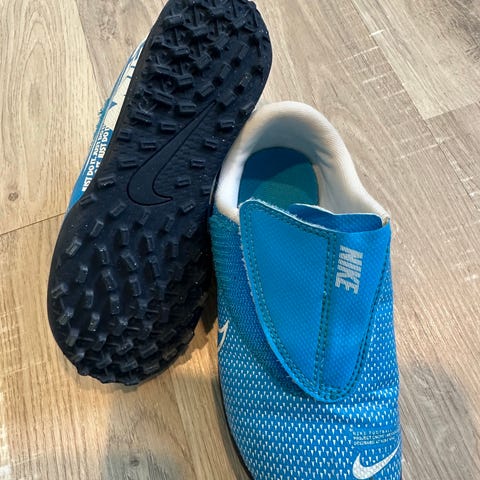 Nike fotballsko for barn i blå med svart yttersåle. Knottemønster til bruk på kunstgress eller grus. Overdel i syntetisk materiale med tildekket snøring for jevnere sparkeflate.