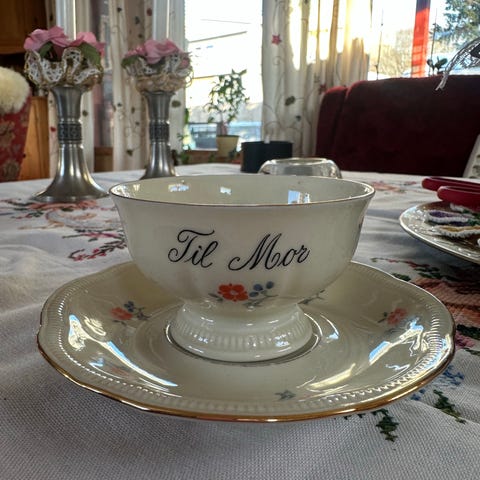 2 stk Porsgrund Til Erindring kopp med skål i porselen. Serviset er hvitt med blomsterdekor og teksten «Til Erindring» på koppen. Både kopp og skål har gullfarget kant. Egner seg til servering av kaffe eller te. Leveres i original eske slik som vist på bildene.