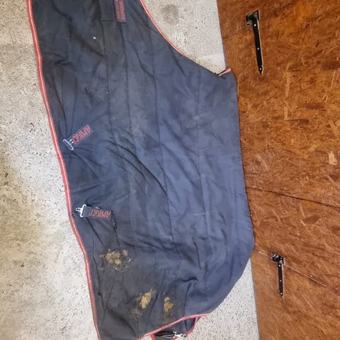 Lite brukt, noen små overfladiske skrapemerker pe en side og sømmen har gått litt opp langs ene kanten (se bilde). Dette kan lett syes om man har en ok symaskin. Selges ettersom det har blitt for lite for min hest. Følger også med en hals som er hel og pen. Brukt en gang!