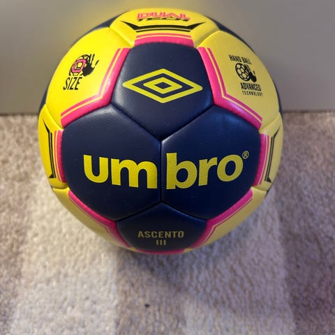 Umbro håndball i blå og oransje farge. Ballen har klassisk håndballkonstruksjon med flere paneler sydd sammen. Egnet til håndballspill innendørs eller utendørs, avhengig av underlag og behov. Passer til trening og lek for barn eller unge, avhengig av størrelse.