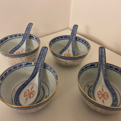 6 Kina-skåler med skjeer i porselen i blått og hvitt mønster. Egnet til servering av for eksempel suppe, nudler eller risretter og selvsagt dessert 😊Skålene har dekor langs kant og bunn, og skjeene har matchende mønster. Ingen skader.