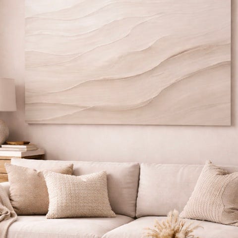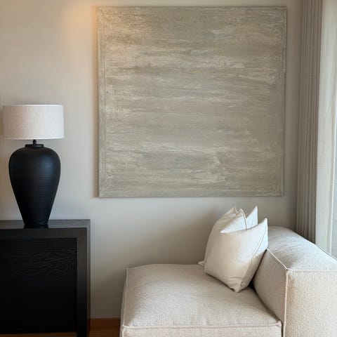 Abstrakt maleri på lerret i beige og grå toner, inspirert av mønster på marmor, med tekstur og et organisk uttrykk