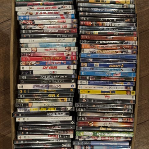 Samling med diverse DVD filmer og TV-serier i originalcover. Bildene viser et utvalg av titler i ulike sjangre, blant annet komedie, action, familiefilm og drama, samt enkelte sesonger av TV-serier. Alle DVD-ene leveres som fysisk format på plate med plastcover. Egner seg for avspilling på standard DVD-spiller eller kompatibel enhet som støtter DVD-medier. Antall titler og konkrete filmer fremgår av bildene i annonsen.