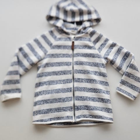 H&M jakke for barn i størrelse 98. Den har flerfargede horisontale striper og hel glidelås foran. Modellen har høy krage og litt forlenget bakside for bedre dekning. Egnet som lett mellomlag på vinteren eller jakke til vår/høst når temperaturen begynner å bli varmere.