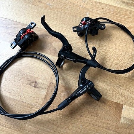 Bremsesettet var montert på en ny sykkel og ble byttet før sykkelen ble tatt i bruk. Under demonteringen måtte bremseslangene kuttes for å kunne tre disse gjennom festepunktene. Systemet må derfor fylles på nytt med olje ved montering.