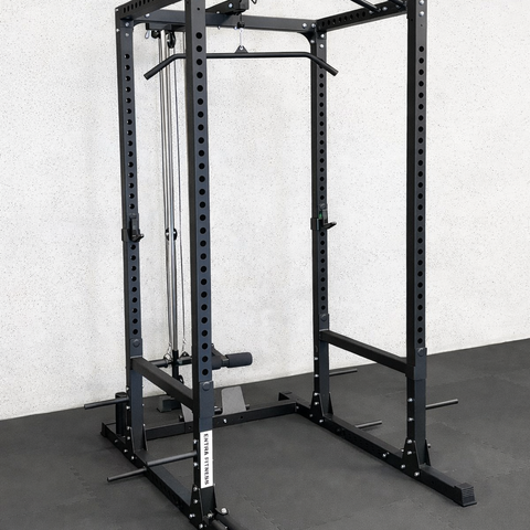 Power rack med kabeltrekk i svart og rød stålramme. Stativet har justerbare hull i stolpene for plassering av sikkerhetsstenger og j-hooks til vektstang. Innebygd kabelsystem med øvre og nedre feste gjør det mulig å trene ulike trekkøvelser. Egnet for styrketrening som knebøy, benkpress, markløftvarianter og kabeløvelser i hjemmegym eller mindre treningsrom. Selges uten vekter og stang.