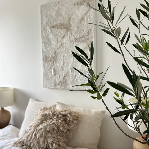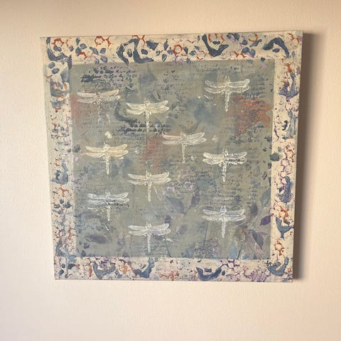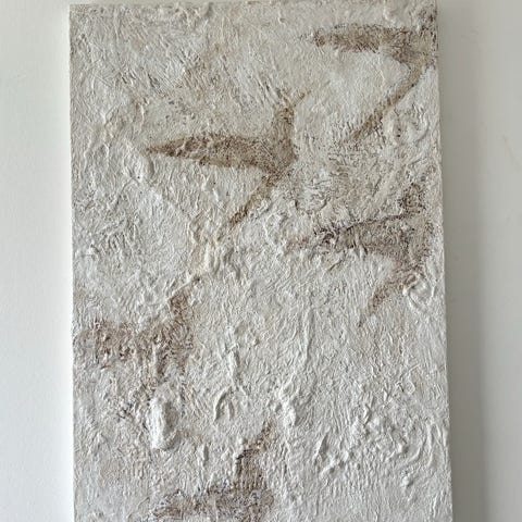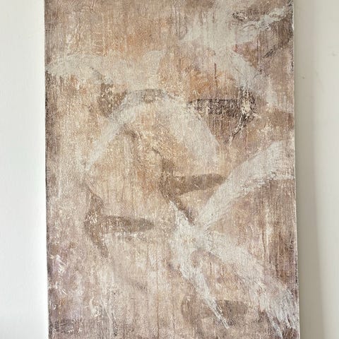 Veggbilde med abstrakt fuglemotiv i nøytrale beige- og bruntoner. Organisk og taktilt uttrykk, malt av meg.