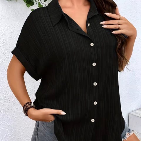 Pen og behagelig bluse i svart med volanger på skuldrene, fra røyk og dyrefritt hjem.