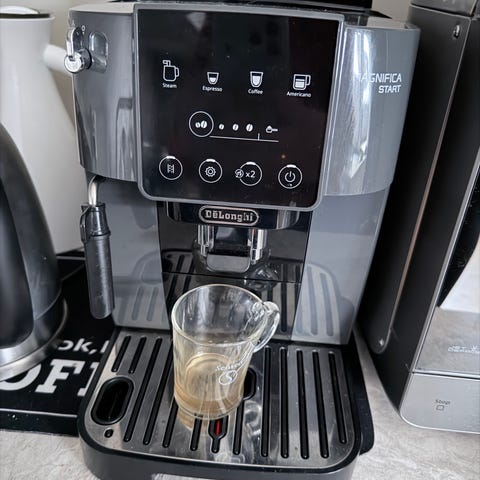 De'Longhi helautomatisk espressomaskin i svart utførelse. Maskinen har integrert bryggeenhet med frontpanel som gir tilgang til flere kaffetyper via trykknapper. Den har dampdyse på siden for skumming og oppvarming av melk, samt uttak for varmt vann. Dryppbrett og risten under koppen er avtakbare for enklere rengjøring. På toppen er det en flate som kan brukes som koppvarmer. Egnet til tilberedning av espresso, kaffe og melkebaserte drikker i hjemmet eller på liten arbeidsplass.