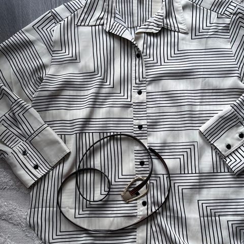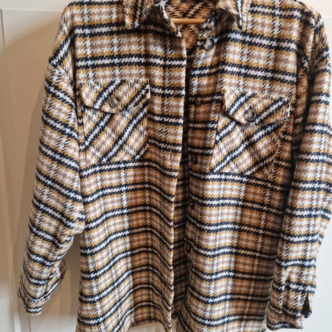 H&M skjorte for dame i størrelse M. Skjorten er flerfarget med rutemønster i blant annet blått, hvitt og mørke toner. Materialet er polyester, akryll og litt ull. Modellen har krage, knappelukking foran og to brystlommer med klaff og knapp. Ermene har mansjetter med knapper. Relativt tykt stoff.