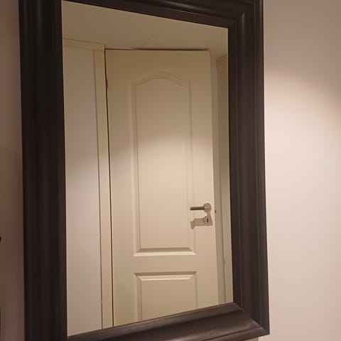 IKEA HEMNES speil med rektangulær form. Speilet har en mørk brun ramme i trelook. Mål er 75 bredde og 165 cm høyde, målt ytterkant ramme. Kan brukes som helfigurspeil eller henges opp liggende