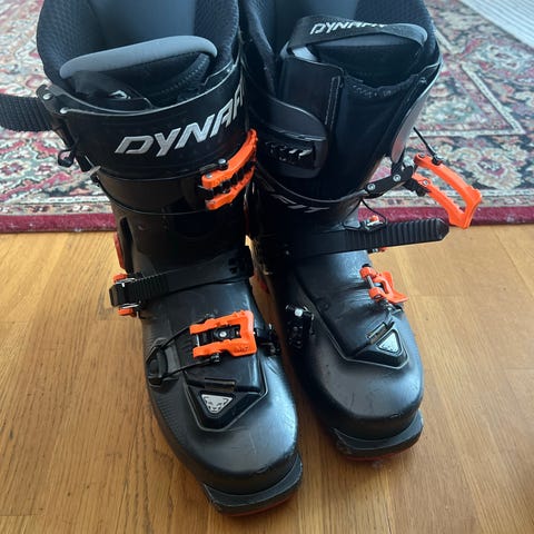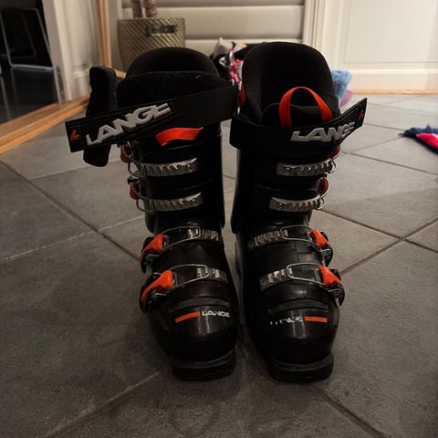Lange alpinstøvler i svart med oransje og sølvfargede detaljer. Støvlene har fire justerbare spenner og powerstrap øverst for bedre tilpasning rundt leggen. Sålen er merket med 225 mm sålelengde. Passer til bruk i alpinanlegg med standard alpinbindinger. Egnet for alpinkjøring på ski for barn eller personer som bruker tilsvarende skostørrelse, avhengig av individuell passform.