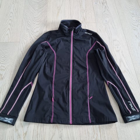 2XU løpejakke for dame i størrelse Medium. Jakken er svart med rosa detaljer og hel glidelås i front. Den har høy krage og lange ermer. Egnet som ytterlag til løping og annen trening utendørs.