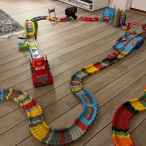 Flexi trax - byggesett til bilbane, to biler og kontroller følger med, en kasse full med masse gøy bygging.
