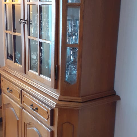 Vitrineskap med underskap,skuffer og lys. Glasshyller på innsiden, og speil på veggen. Passer fint for oppbevaring og utstilling av servise, glass og pyntegjenstander. Toppen har profilert og dekorert avslutning.