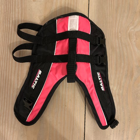 Vesten har bærehåndtak på ryggen, kraftig D-ring for kobbel og justerbare stropper. Modell Splash.
