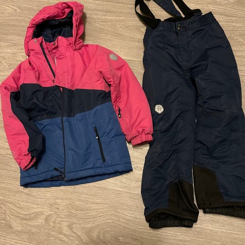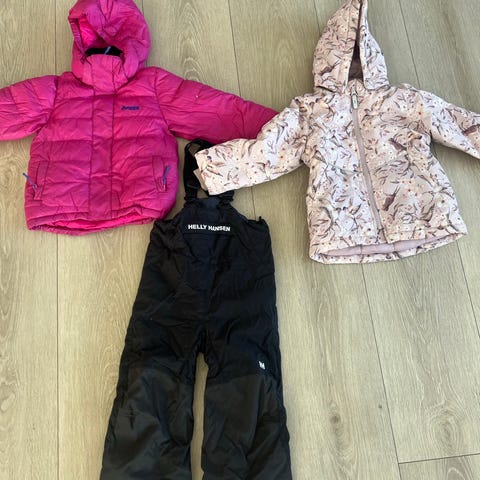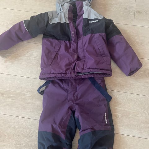 Jakken er i str 100 og buksen i 104/110, men jeg vil si buksen er mer en str 100.
