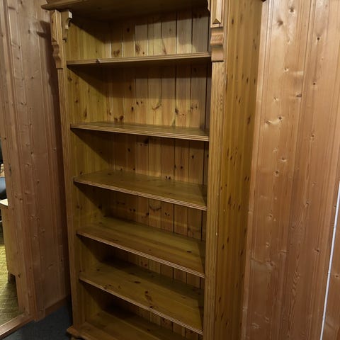 Pent brukt bokhylle i furu, med to skuffer nederst.