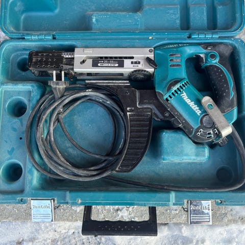 Verktøyet leveres i original Makita-koffert med tilhørende tilbehør som vist på bildene. Egnet for montering av gipsplater og andre skruearbeider der jevn og kontrollert skruing er nødvendig. Elektrisk modell med pistolgrep og justerbar dybdeinnstilling for presis skrueplassering. Passer til profesjonelt bruk og hobbybruk innen innredning og byggarbeid.