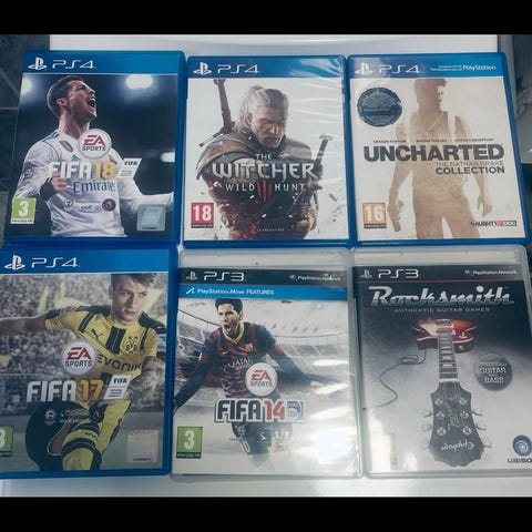 Sony Playstation 4 spillpakke med flere titler. Bildet viser blant annet FIFA, Call of Duty, Watch Dogs, Gran Turismo, Mafia, Battlefield og The Crew til PS4. Spillene leveres i originale PS4-covere slik de fremkommer på bildet. Egnet for Playstation 4-konsoll og for brukere innenfor aldersgrensene som er angitt på hvert enkelt spillomslag.