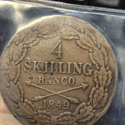 Meget dekorativ og pedagogisk overpreg – flott eksempel på reformpreging hvor eldre mynt ble brukt som blankett.
