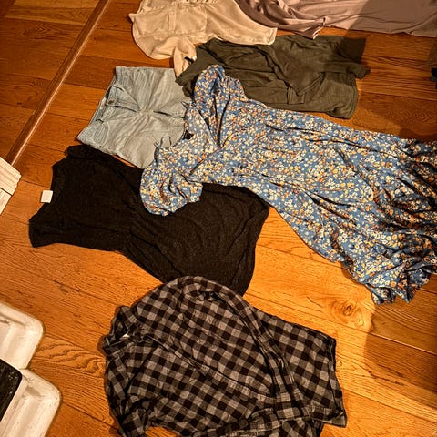 - 3 bukser: 1 fritidsbukse, en tynnere kakibukse og en dressbukse. Sømmen som er nederst på det ene buksebenet på dressbuksen er gått opp og må legges opp.