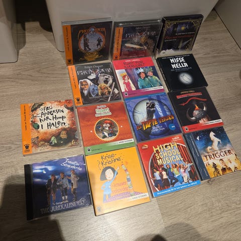 Samling med flere CD-plater med norske eventyr og hørespill for barn. Motivene på coverne viser klassiske eventyrfigurer og illustrasjoner. CD-ene er nummererte og ser ut til å tilhøre samme serie, i tillegg til en egen CD med tittelen «Gudcliv Løva». Egner seg til lytting hjemme, på reise eller som høytlesningsalternativ for barn. Format: lyd-CD.