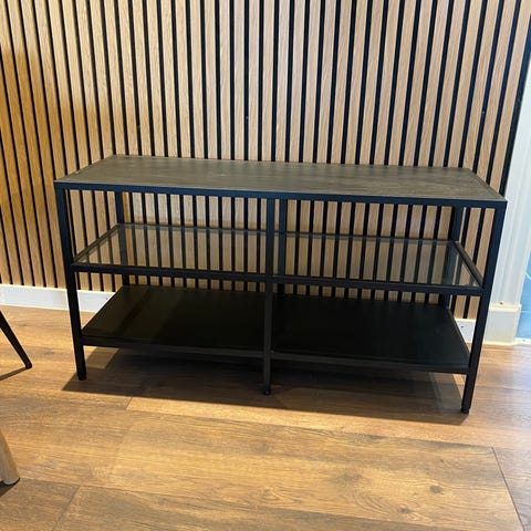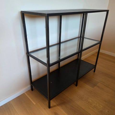 Svart hylle i metall med rette linjer og åpen ramme. Hyllen har flere nivåer, med en kombinasjon av glasshyller og metallhyller. Passer til oppbevaring og utstilling i stue, kontor eller gang. Nøytral, moderne stil som gjør den enkel å plassere sammen med annet interiør.