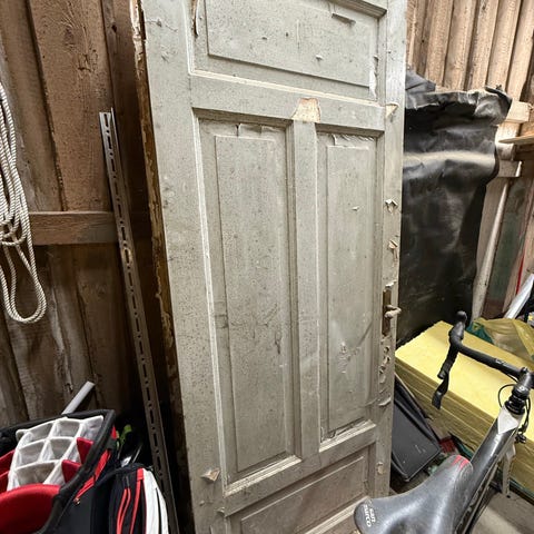 Gammel ytterdør. Uten terskel. Stått i ett fjøs