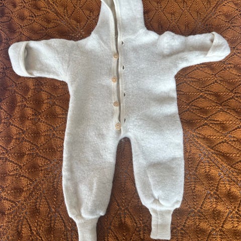 Selger en nydelig ulldress fra Nøstebarn i str 50/56. Vi har vært så fornøyd med denne så kjøpte den i større størrelser også. Varm, myk og god for de aller minste. Opplever den som normal i størrelsen.
